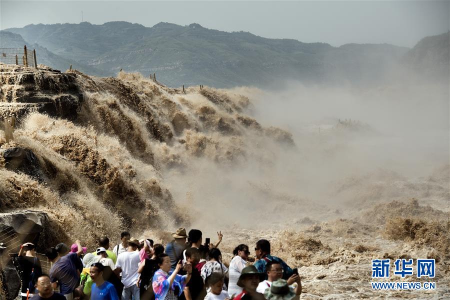 7月19日,游客在陕西境内的壶口瀑布群前留影。 新华社记者 陶明 摄