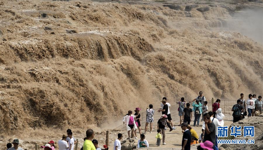 7月19日,游客在山西境内的壶口瀑布群前留影。 新华社记者 刘莲芬 摄