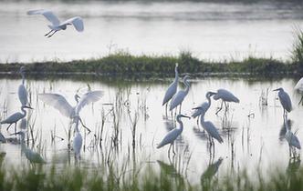 7月30日,白鹭在江苏省盱眙县一处湿地栖息。