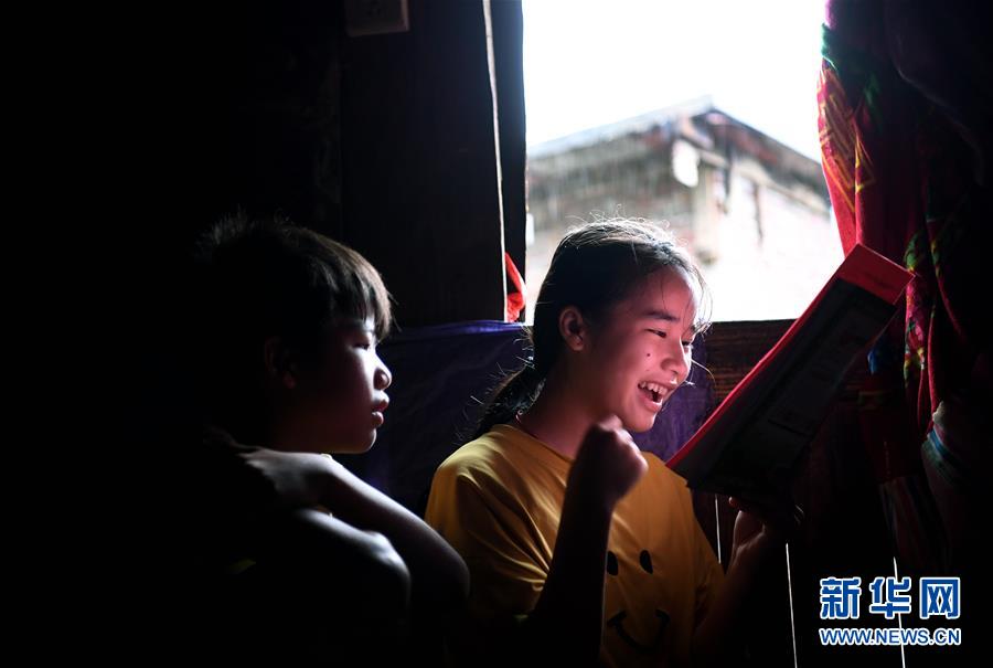 9月1日,梁宏月(右)带着弟弟在窗边大声朗读入学通知书,鼓励弟弟在家也要勤奋读书。新华社发(黎寒池 摄)