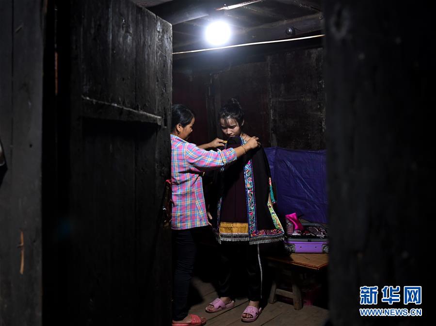 在广西柳州市三江侗族自治县洋溪乡勇伟村,母亲滚培衣把亲手缝制的侗衣拿给女儿梁宏月试穿(8月31日摄)。新华社发(黎寒池 摄)