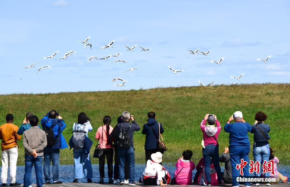 9月6日,海内外游客汇聚黑龙江扎龙国家级自然保护区观看丹顶鹤放飞美景。黑龙江省齐齐哈尔市有“鹤城”美誉,依托扎龙生态资源,着力打造“世界大湿地,中国鹤家乡”旅游品牌。目前,全世界现存野生丹顶鹤约2000只,已列入全球濒危种类,黑龙江扎龙国家级自然保护区有近300只。此外,该区人工繁育和半散养丹顶鹤种群达409只,是中国最重要的鹤类种源输出地和鹤类科研教学基地。 中新社记者 陈文 摄