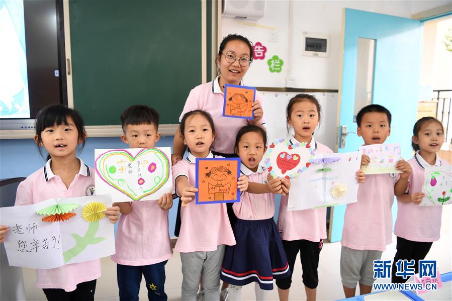 9月10日,合肥市一六八玫瑰园学校小学部的老师和学生们一起展示学生们亲手制作的教师节贺卡。 新华社记者 刘军喜 摄