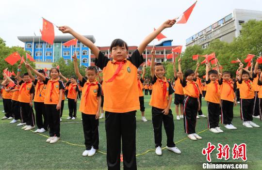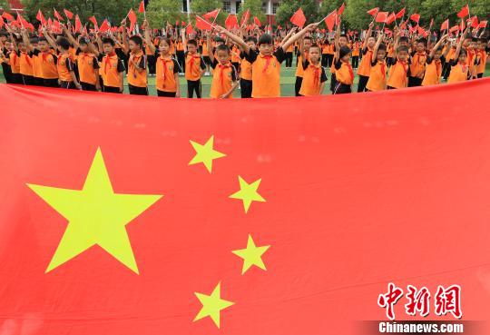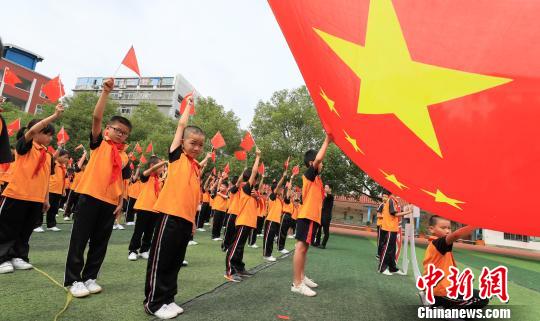 小学生们在鲜红的大国旗前挥舞小国旗。 邓和平 摄