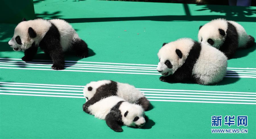 这是9月28日在成都大熊猫繁育研究基地月亮产房拍摄的大熊猫宝宝。 当日,成都大熊猫繁育研究基地为2018年出生的12只新生大熊猫宝宝举行了一场别开生面的亮相活动。 新华社发
