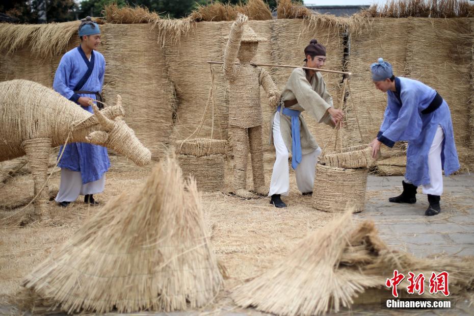 9月28日,古装打扮的男子在江苏常州春秋淹城内用稻草搭建而成的“迷宫”内穿梭游玩,在丰收季体验独特的田园风光。中新社记者 泱波 摄