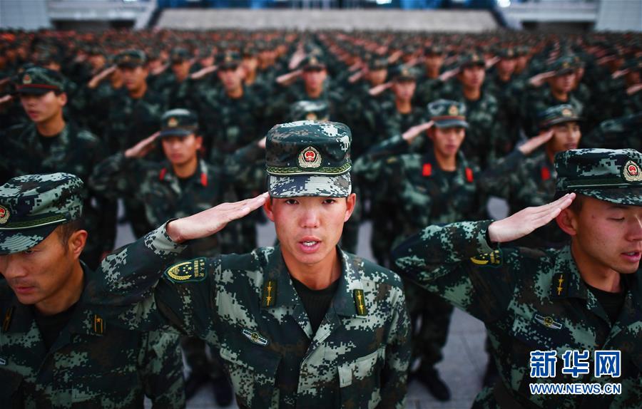 10月1日,武警青海省总队机动第一支队官兵在国庆升旗仪式上。 当日,全国多地举行升国旗仪式,庆祝中华人民共和国成立69周年。 新华社记者 张宏祥 摄