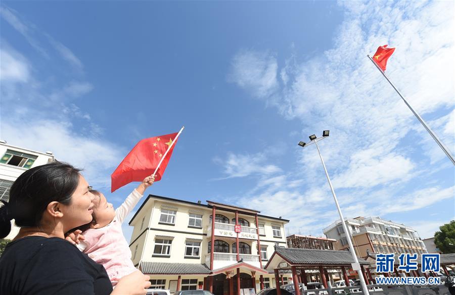 10月1日,在浙江省义乌市下骆宅村,家长带着孩子在村文化礼堂前观看升国旗。 当日,全国多地举行升国旗仪式,庆祝中华人民共和国成立69周年。 新华社发(龚献明 摄)