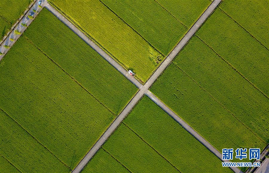 10月8日,在东阳市寀卢村田间,农民在收获晚稻(无人机拍摄)。 连日来,浙江省东阳市晚稻陆续进入收割期,当地农民抢抓农时收获晚稻。 新华社发(包康轩 摄)