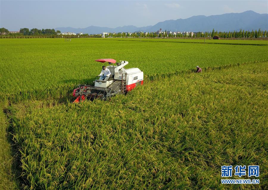 10月8日,在东阳市寀卢村田间,农民在收获晚稻(无人机拍摄)。 连日来,浙江省东阳市晚稻陆续进入收割期,当地农民抢抓农时收获晚稻。