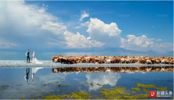 赛里木湖水天一色,这有一对神仙眷侣。图/成都某婚纱摄影机构