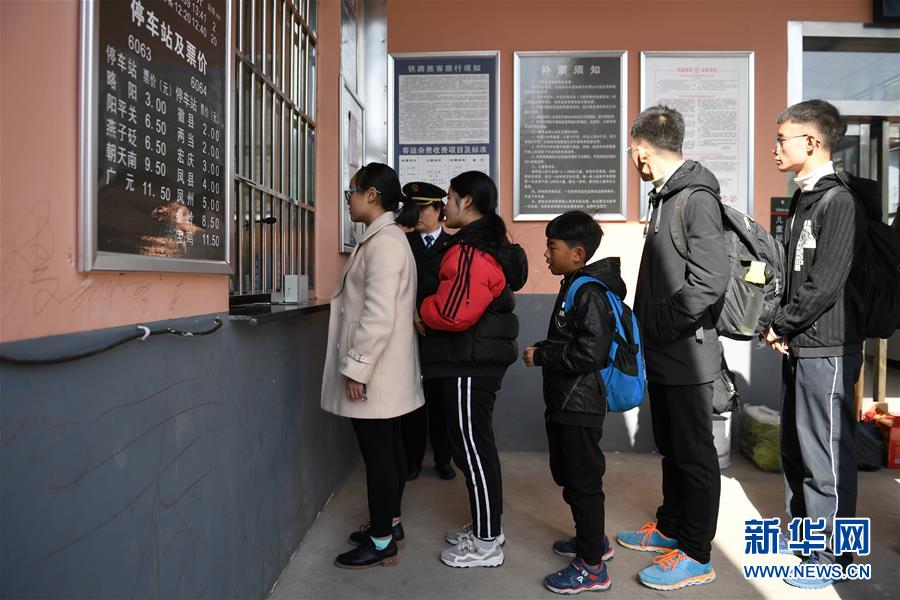 11月18日,刘森(右三)在白水江火车站排队购买车票。 新华社记者李一博摄