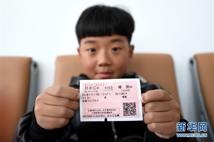 11月18日,刘森在白水江火车站的候车大厅展示6063次列车的火车票,儿童乘坐这趟列车前往略阳只需要1.5元。 新华社记者李一博摄