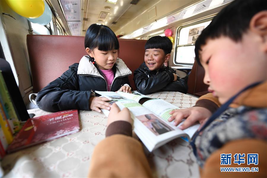 11月18日,刘森(中)和小伙伴们在6063次列车的通学座位上阅读课外书。 新华社记者李一博摄