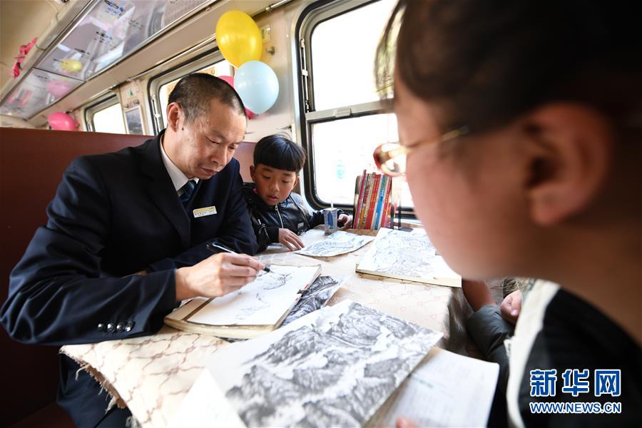 11月18日,刘森(中)在通学座位上观看6063次列车的列车员卫进忠(左)画画。 新华社记者李一博摄