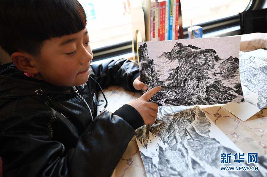 11月18日,刘森拿着列车员的绘画作品,指出画中一列行驶在秦岭中的火车。 新华社记者李一博摄