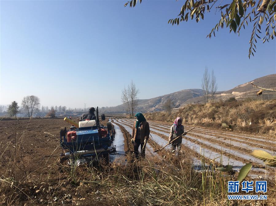 11月13日,桥头村光林种植专业合作社的村民在地里覆上地膜,等来年开春时播种葵花。新华社发(魏玉坤 摄)