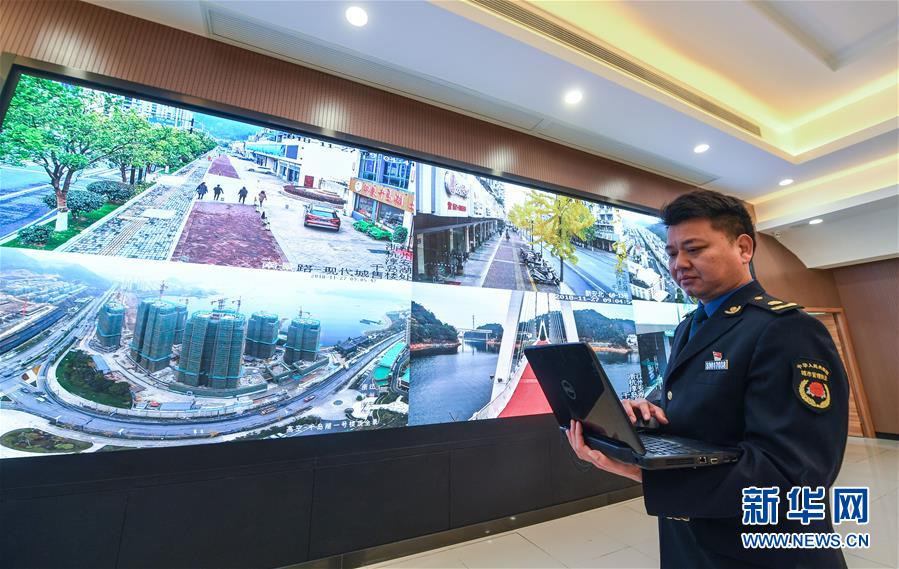11月27日,城管执法队员在淳安智慧城管指挥中心监控街面各类可能出现的城市管理问题。