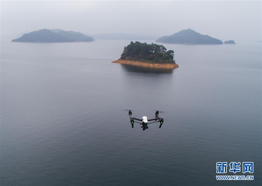 11月27日,城管执法队员在用无人机巡查千岛湖沿湖沿线的影响景观环境的问题(无人机拍摄)。 新华社记者 徐昱摄