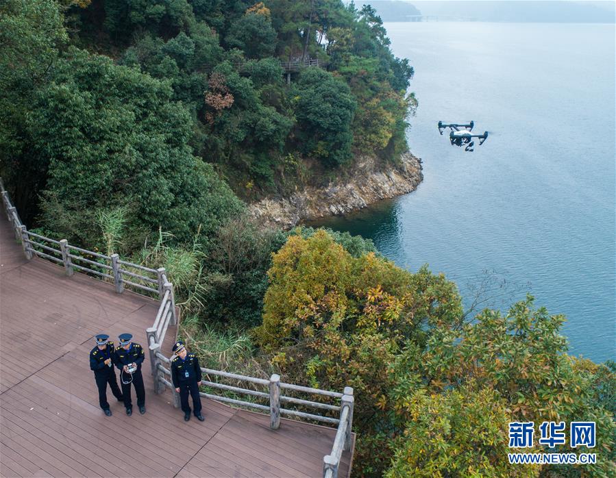 11月27日,城管执法队员在用无人机巡查千岛湖沿湖沿线的影响景观环境的问题(无人机拍摄)。 新华社记者 徐昱摄