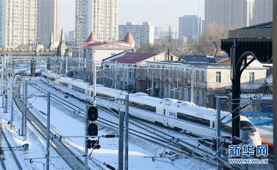 12月25日,哈牡高铁首列动车组列车驶出哈尔滨火车站。 当日,哈尔滨至牡丹江高速铁路开通运营,全线运营时速250公里。 新华社记者 王建威 摄
