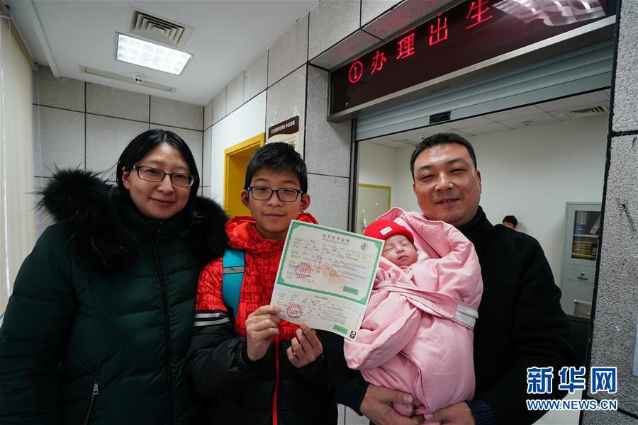 1月1日,在南京市妇幼保健院,为二胎宝宝领取新版出生医学证明的顾先生一家四口合影留念。