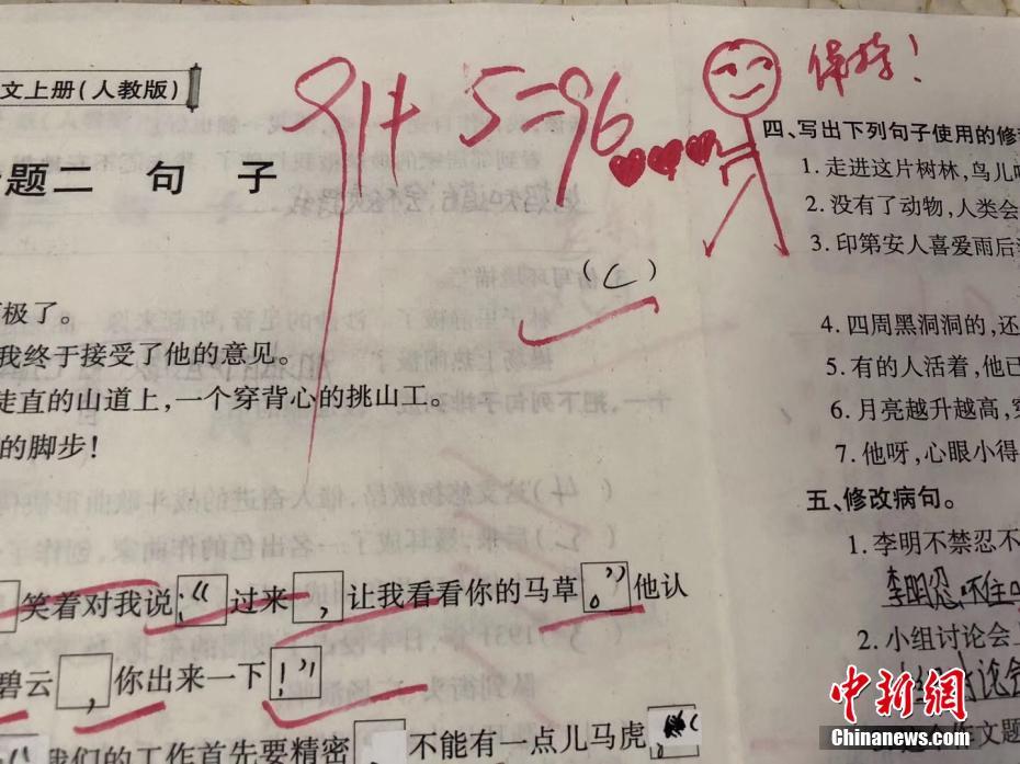 近日,贵州省凯里市一名小学女教师在批改试卷时,在10多名学生试卷上画卡通画,以鼓励和鞭策学生学习的事在当地朋友圈“火了一把”。今年43岁的胡晓瑾是凯里市第十小学六年级语文老师,已从教23年的她,近日在批改所任班级语文句子专项测验试卷时,对10多名她认为是进步、保持及退步的典型学生,在给予分数之后特意在试卷上画了可爱的卡通画。胡老师说,在试卷上画卡通画是想表达对学生的重视与关心,目的是换一种有趣的方式来鼓励孩子们好好学习,努力向上。而孩子们看到试卷也很惊喜:“平日里严厉的老师也有可爱的一面!”文/陈莉 蒲文思 图/陈莉