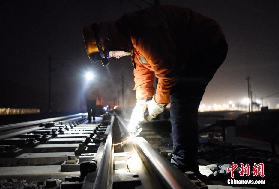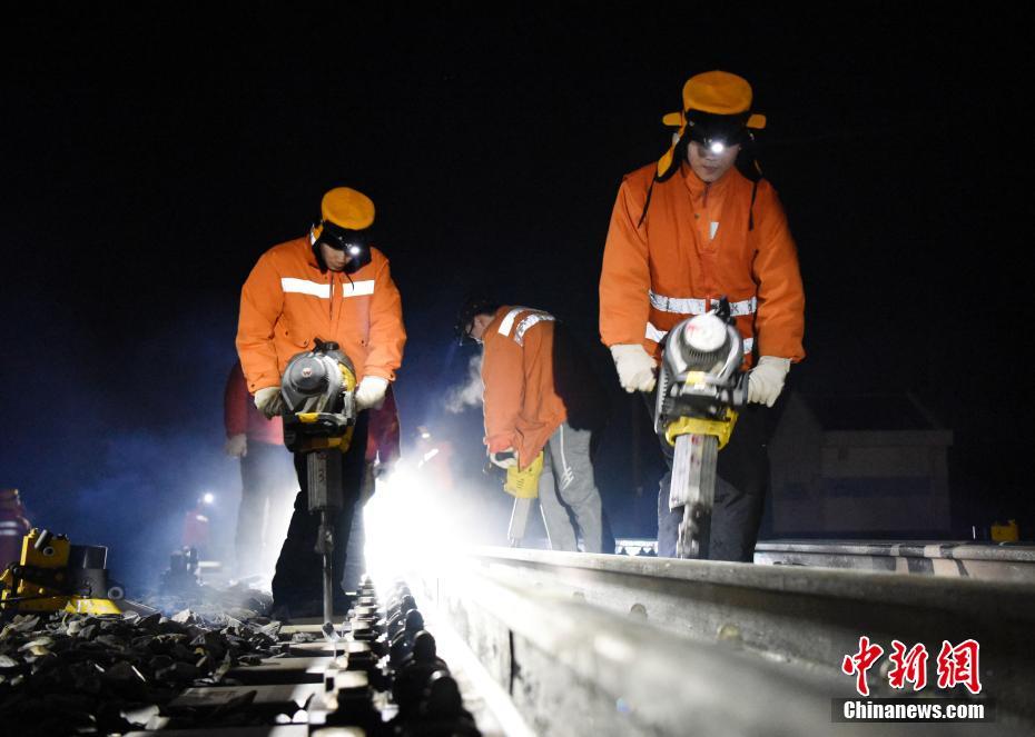 2019年春运,是九景衢铁路开通后的第二个春运。1月24日凌晨,中国铁路南昌局集团有限公司九江桥工段职工利用夜间列车间隔“天窗”时间,加大对道岔、线路设备质量检查整治力度,确保列车运行安全。由于是夜间作业,这帮铁路职工犹如是九景衢铁路上的“夜精灵”。王浩 摄