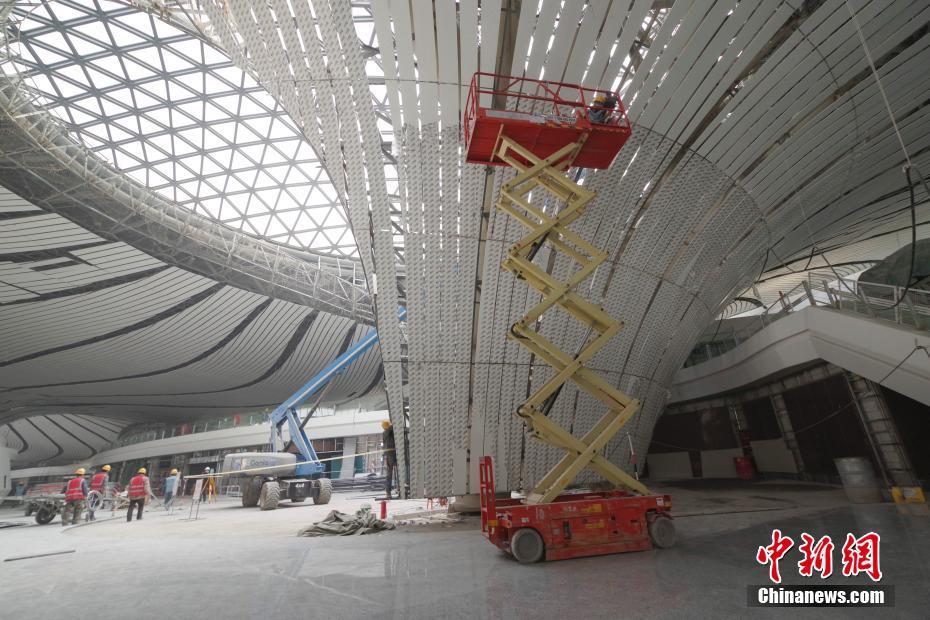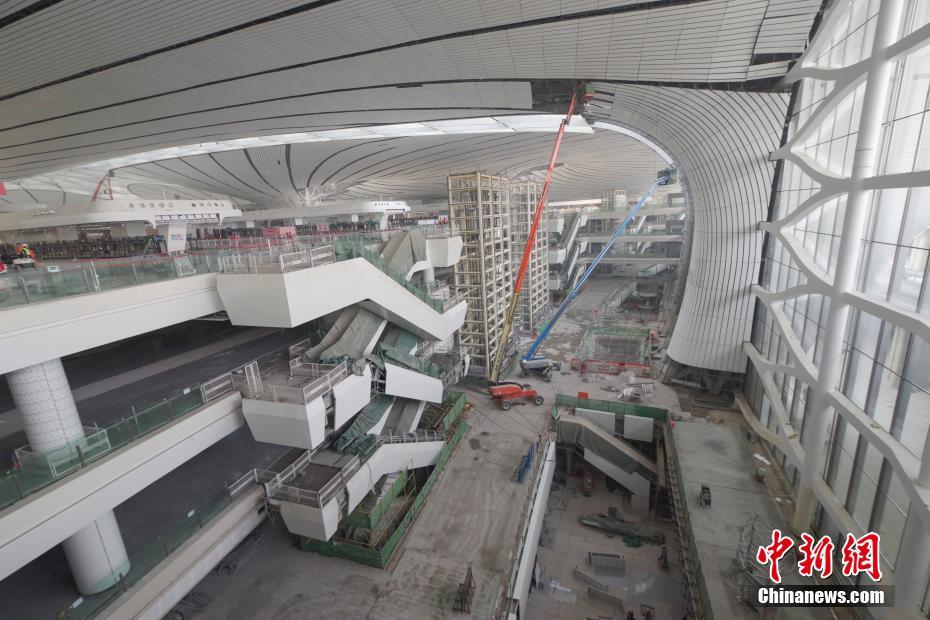 1月24日,距离北京大兴国际机场竣工倒计时157天之际,中新社记者探访新机场建设和航站楼内部情况。北京大兴国际机场预计于2019年6月30日竣工。图为航站楼内部正在紧张施工。中新社记者 贾天勇 摄