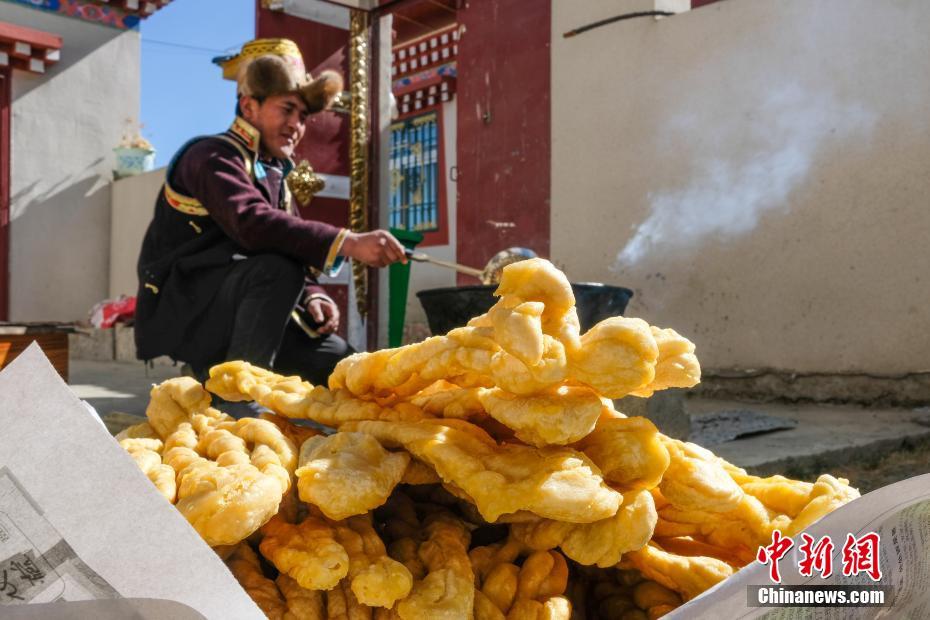 1月24日,西藏自治区林芝市朗县东部松木材村村民正在炸卡塞(卡塞是一种油炸面食,是藏历新年必备的年货之一)。2017年松木材村被确定为边境小康建设示范村,总投资1670万元人民币,用于29户民房以及相关设施的新建,目前建设已全部完工,当地村民于2018年8月前全部搬迁入住,2019年将是松木材村村民在新家度过的“首个”春节藏历新年。中新社记者 何蓬磊 摄