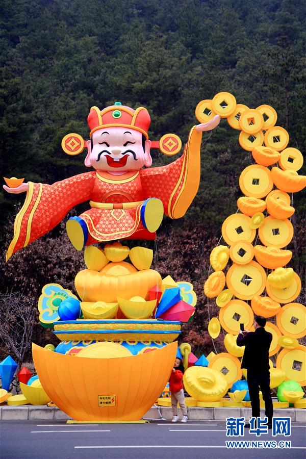 1月24日,在湖北省十堰市郧阳区茶店镇樱桃沟村,游人在“财神到”花灯前拍照留影。 春节临近,各地张灯结彩,营造出浓浓的节日气氛。 新华社发(曹忠宏 摄)
