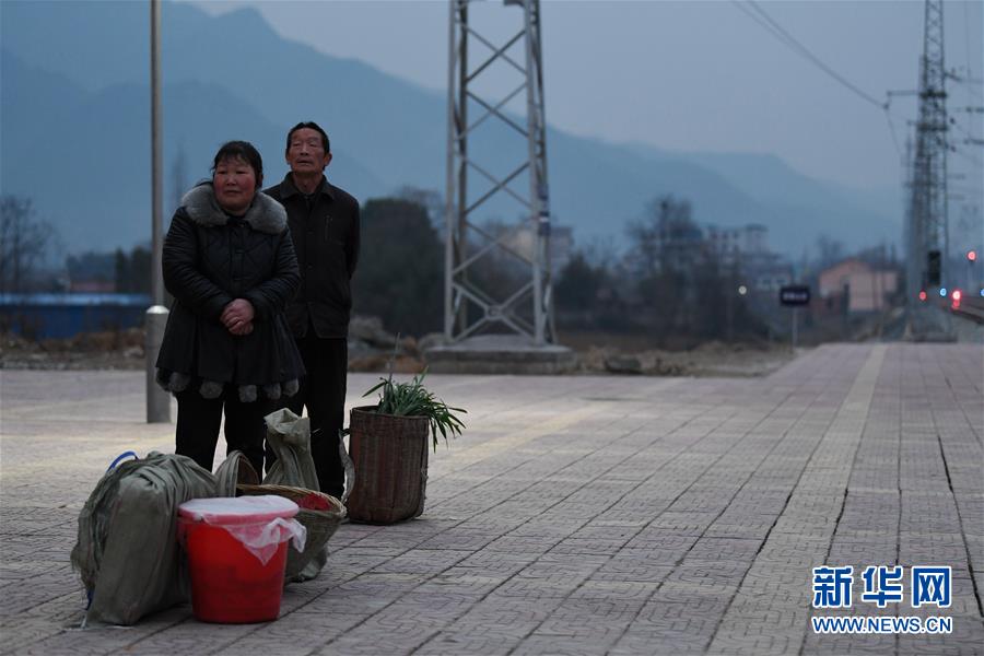 1月24日,家住汉中市宁强县大安镇的邵艳红(左)与雷云发在宁强站候车。 新华社记者 张博文 摄