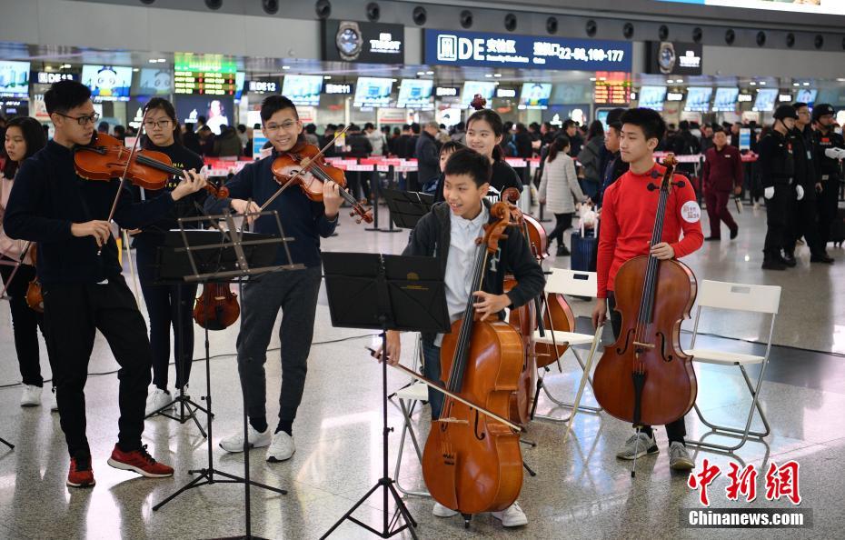 1月27日,四川成都双流国际机场T2航站楼,香港圣保罗男女中学的同学们演奏乐曲。当日,川港青少年在该机场玩“快闪”,嘹亮的歌声、优美的舞蹈、悠扬的琴声吸引来往的春运旅客驻足欣赏。