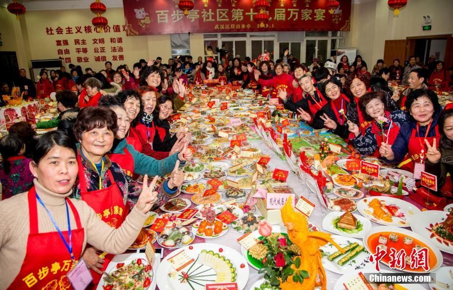 1月29日正值中国南方农历小年,武汉百步亭社区万家宴热闹开席,社区居民端出13000多道自制菜品,4万多个家庭欢聚一堂共品佳肴。