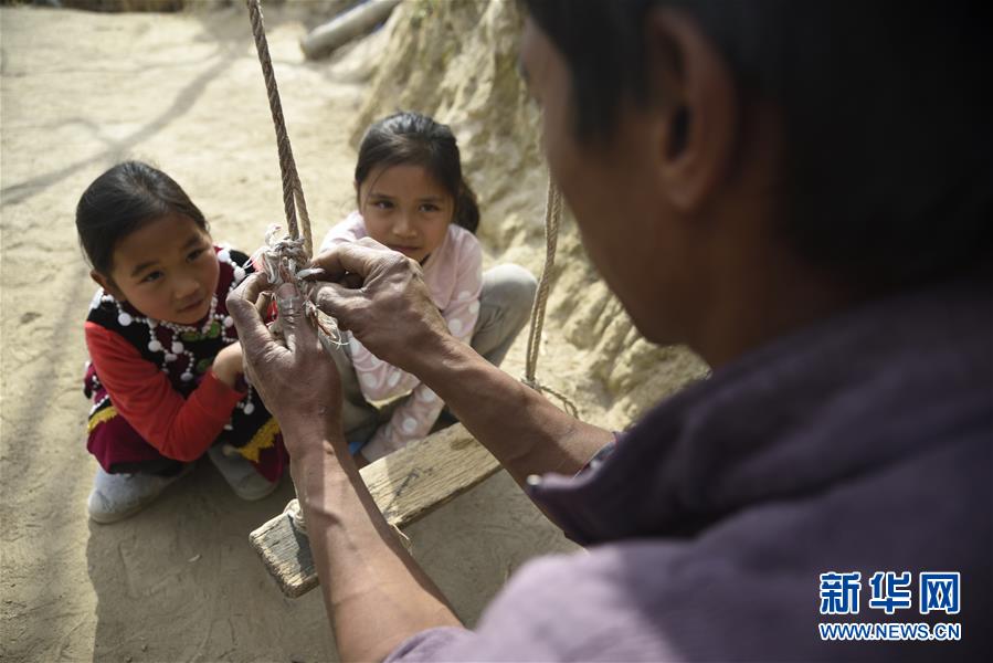 1月28日,杨雨轩(左)与姐姐杨祖轩(右)蹲在秋千下,看着爸爸给秋千换绳子。 新华社记者 毛鑫 摄