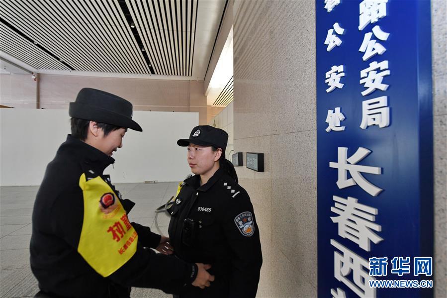 2月5日,在长春西站,王蕾(前)和赵一非在站内巡逻。 新华社记者 张楠 摄