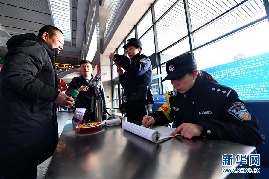 2月5日,在长春西站治安检查点,王蕾(右一)和赵一非(右二)登记查扣的违禁物品。 新华社记者 张楠 摄