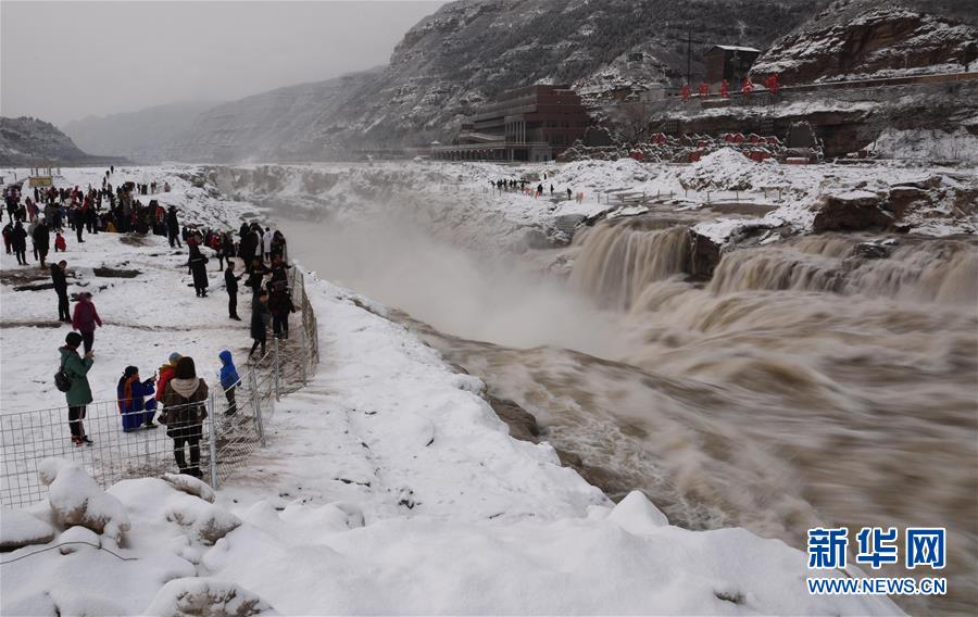 2月10日,游人在山西吉县黄河壶口瀑布景区欣赏雪后瀑布。 从2月9日开始,山西南部多个地区出现降雪天气。 新华社发(吕桂明 摄)