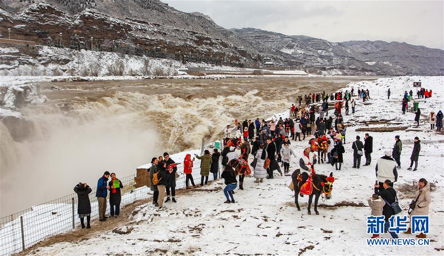 2月10日,游人在山西吉县黄河壶口瀑布景区欣赏雪后瀑布。 从2月9日开始,山西南部多个地区出现降雪天气。 新华社发(饶北成 摄)