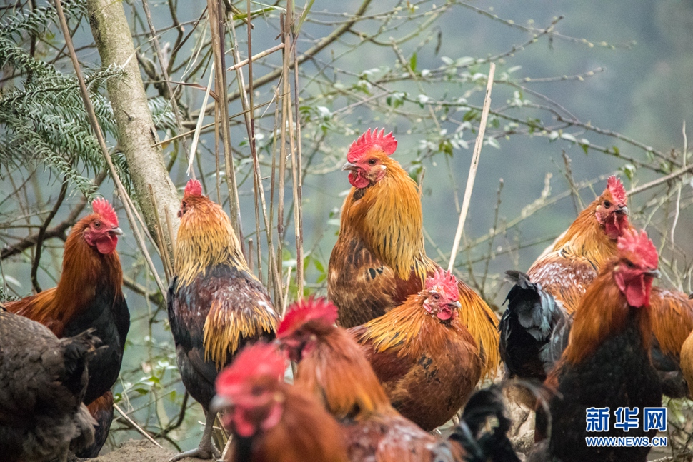 位于原岩坡村山坳中养鸡场散养的鸡群。这是由当地贫困户联合成立的农民专业合作社,它改变了村民以往家禽饲养主要用于自家食用的传统习惯,成为村民创收的新途径、新模式。新华网记者李林 摄