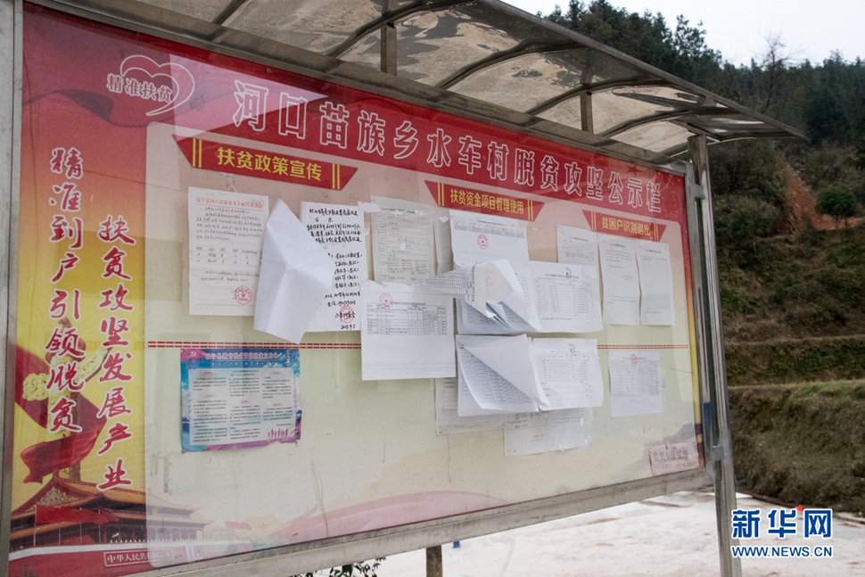 水车村脱贫攻坚公示栏。这里提供扶贫政策宣传、扶贫资金项目管理使用、贫困户识别退出等信息,以保障脱贫攻坚工作的公开和公正。新华网记者李林 摄
