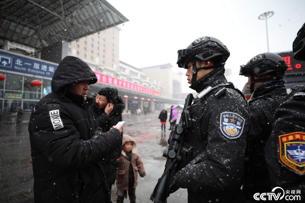 图为2月12日,北京大雪,参加安保任务的特警队员们在北京各大火车站值守,保障旅客春运返程安全。(北京铁路公安处供图)