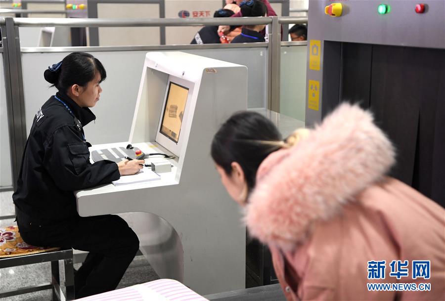 2月15日,安检人员在南宁东站用安检探测仪为乘客安检。 春运期间,中国铁路南宁局集团有限公司南宁东站各岗位工作人员各司其职,保障每天200多对列车正常进出站,服务约6万名旅客顺利乘车。 新华社记者 周华 摄