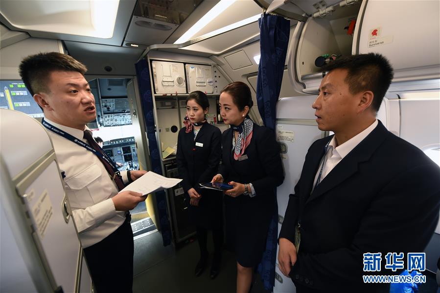 2月14日,在MU2415兰州至北京的航班上,机长詹恒(左一)在航前准备会上给张莉(右二)、孙大平(右一)等机组人员交代注意事项。 新华社记者 范培珅 摄