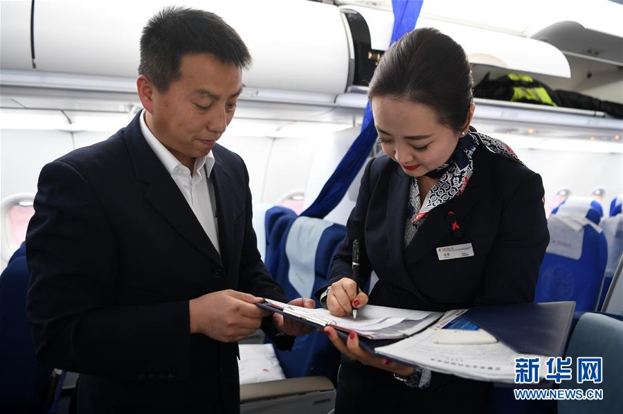 2月14日,在MU2416北京至兰州航班旅客登机前,张莉(右)在孙大平填写的客舱安保检查单上签字。 新华社记者 范培珅 摄