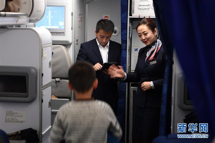 2月14日,在MU2415兰州至北京的航班上,张莉(右)和孙大平(左)送乘客下机。 新华社记者 范培珅 摄