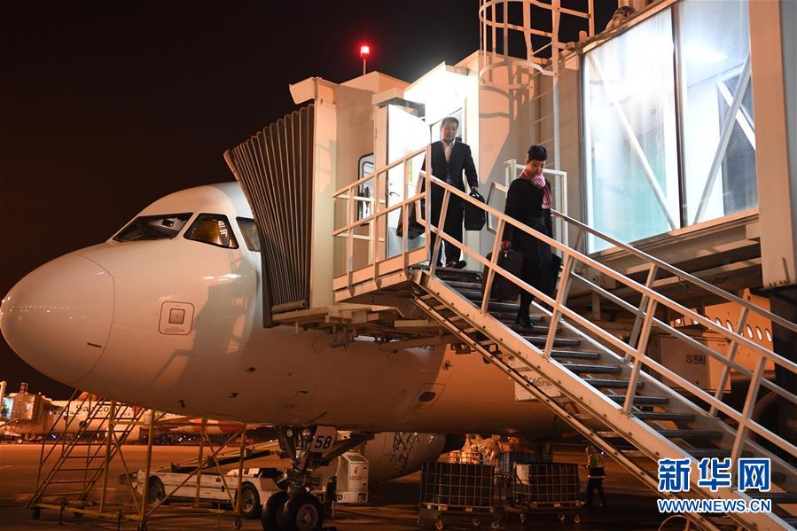 2月14日,在兰州中川国际机场停机坪,张莉(右)和孙大平执行完保障任务后从廊桥走下飞机。 新华社记者 范培珅 摄