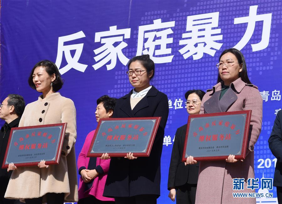 3月7日,基层法律援助工作者在活动现场接受“反家庭暴力维权服务站”牌匾。 当日,山东青岛市妇联组织开展“拒绝家庭暴力 共建和谐家园”宣传活动,法律工作者、妇女维权志愿者现场提供法律咨询和援助,并向首批反家庭暴力维权服务站授牌。 新华社记者 李紫恒 摄