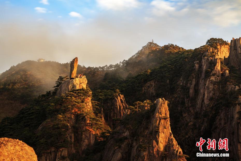 安徽黄山风景区日落时分,现大面积云海景观,夕阳余晖铺洒在云海之上,光辉万丈,移步换景,每个角度都是一副绝妙的山水图画。图为傍晚时分,夕阳下的黄山飞来石周围烟雾环绕。