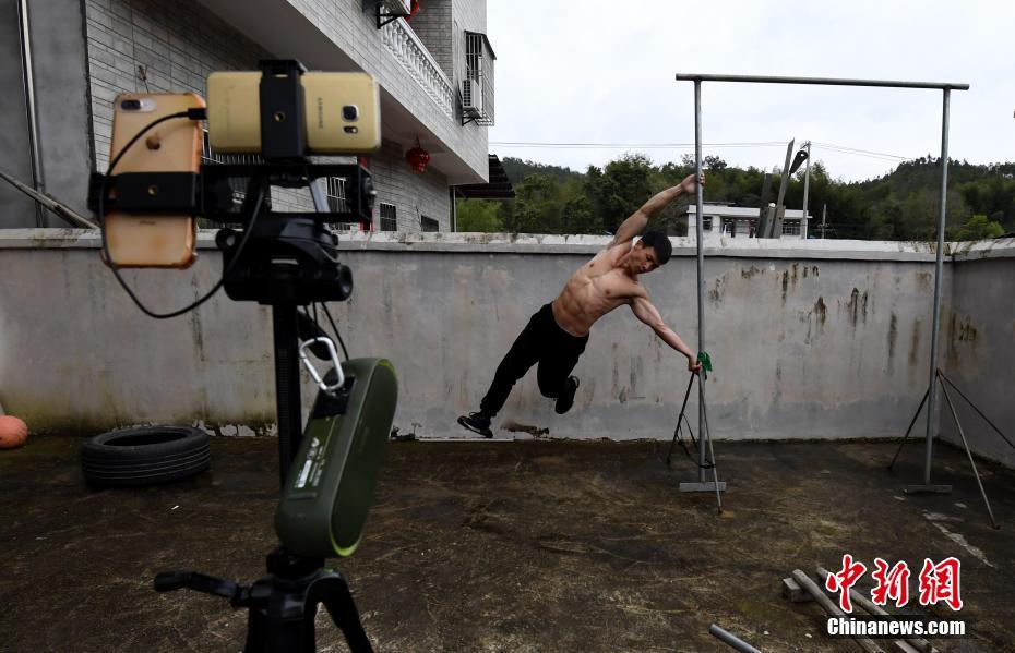 杀猪桌、石头、破旧的窗户、黑色长绳、由自来水管焊成的单杠、竹竿。在福建省龙岩市长汀县童坊镇举河村31岁的黄海木不办健身卡,不买专业健身装备,就地取材,靠家里的杀猪桌、竹竿练出了迷人马甲线和腹肌。如今,变成肌肉达人的黄海木在某网络直播平台是网红主播“呆木头”,吸粉13万。图为黄海木正在通过手机直播其健身锻炼。张斌 摄